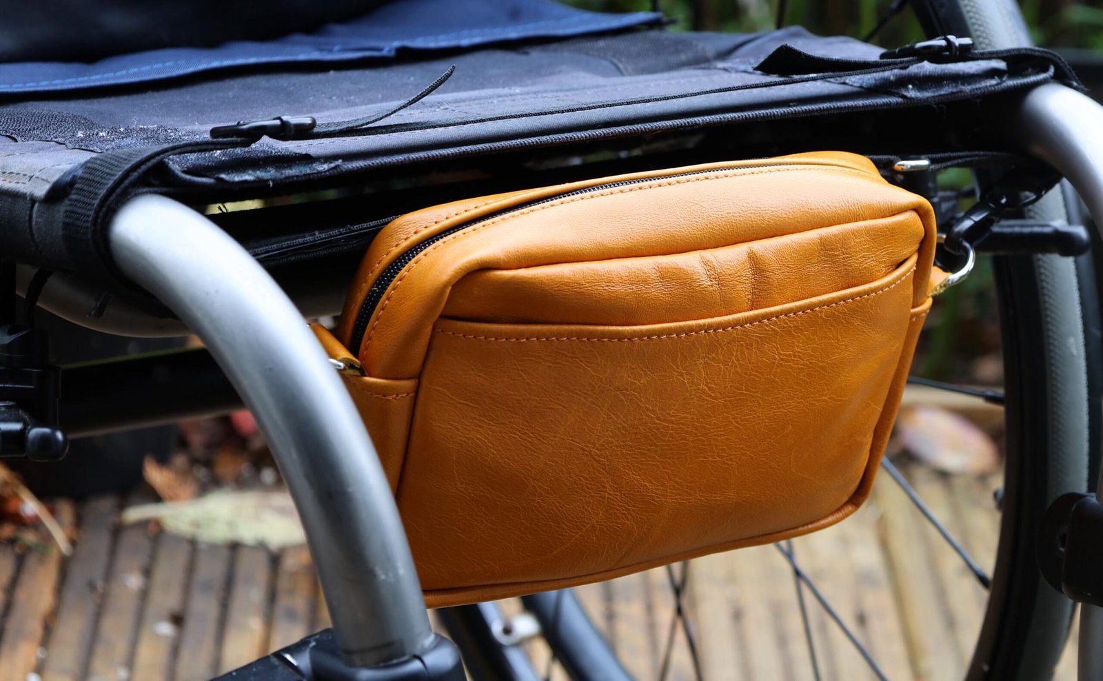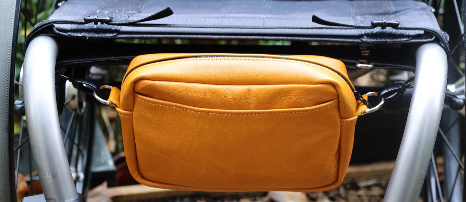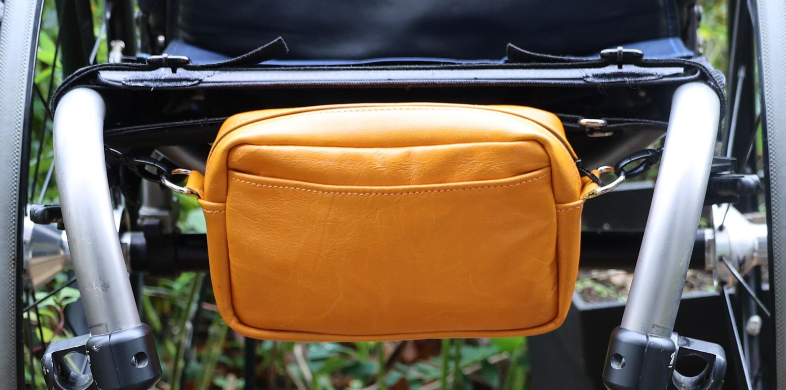 Genuine Yellow Leather Under seat wheelchair bag complete with fixing strap and release clips, has a front open pocket and the main compartment with a zip closure.