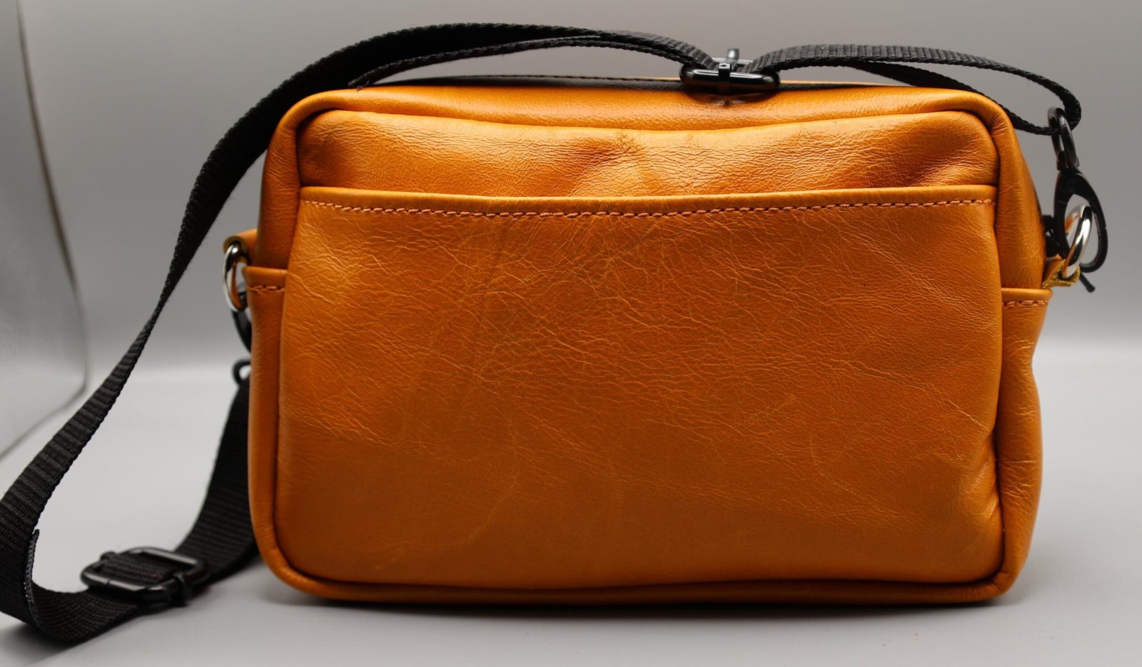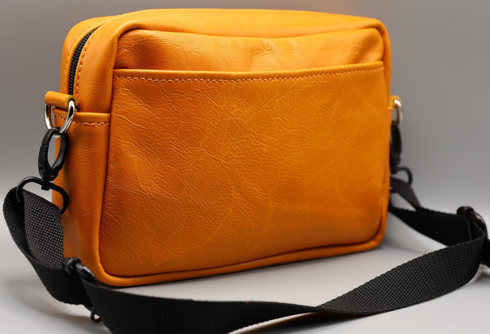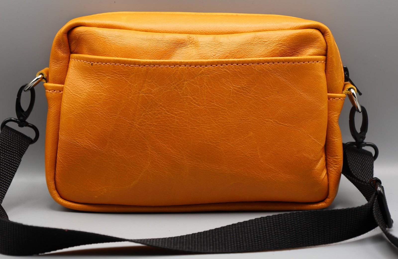Genuine Yellow Leather Under seat wheelchair bag complete with fixing strap and release clips, has a front open pocket and the main compartment with a zip closure.